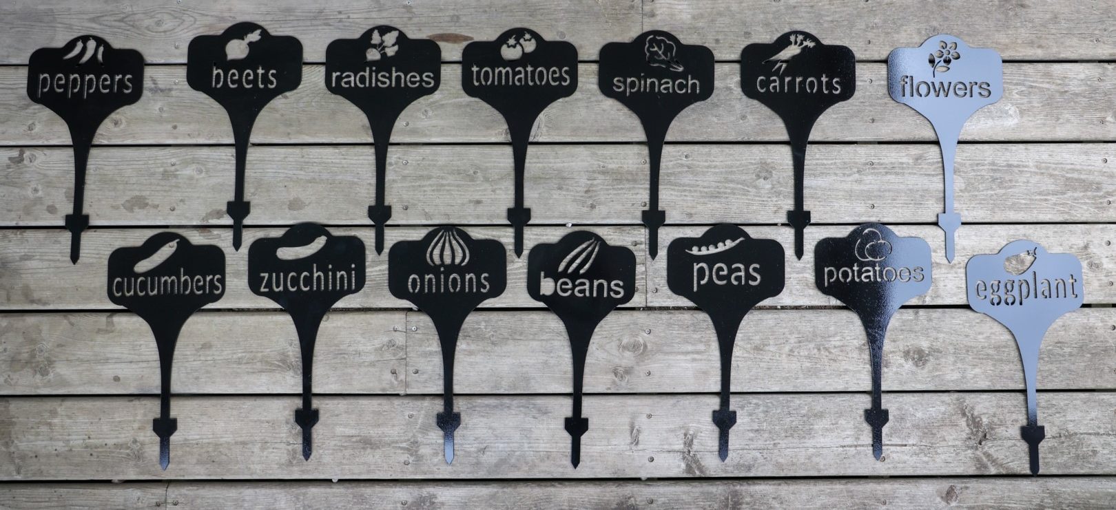 Set of 20 beautiful and unique garden markers, CNC cut from steel heavy enough to last a lifetime. Finished with gloss rust paint. Free shipping anywhere in Canada!